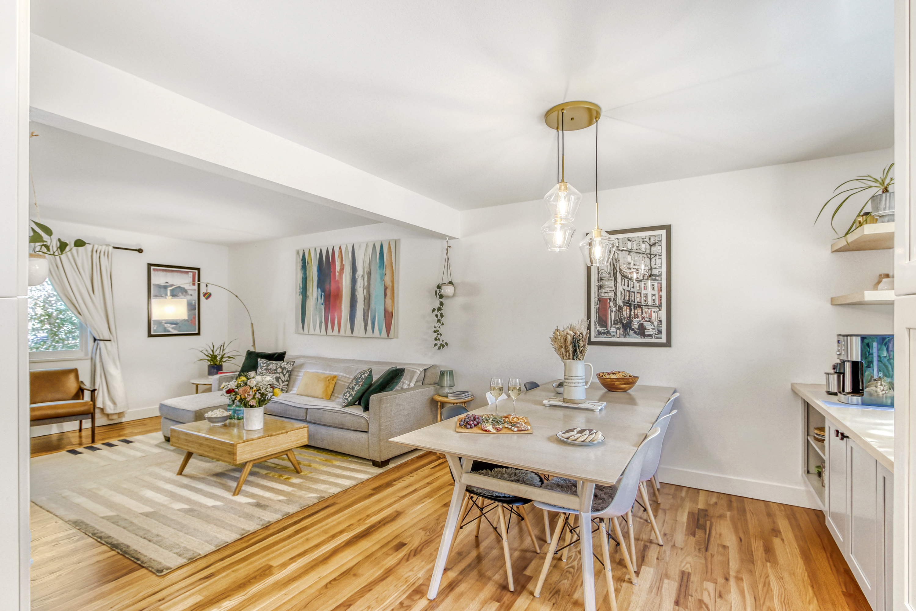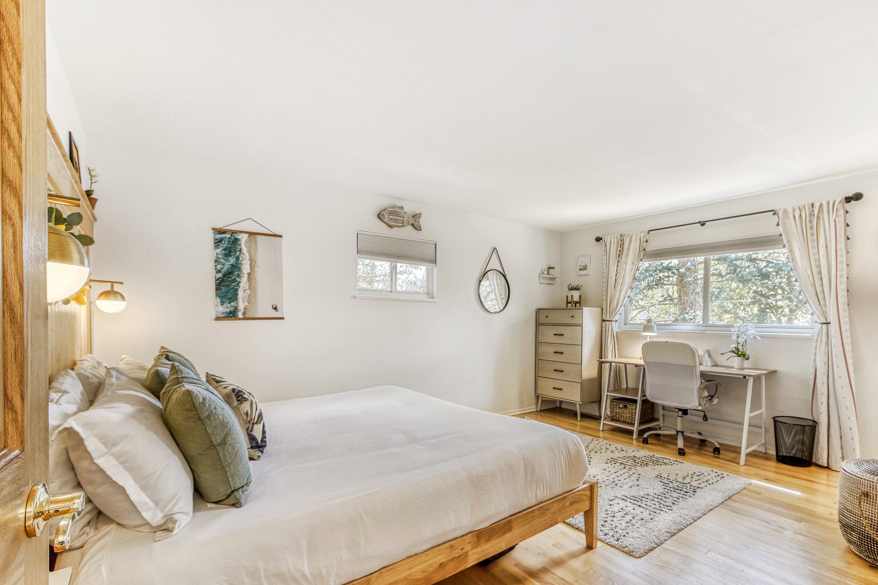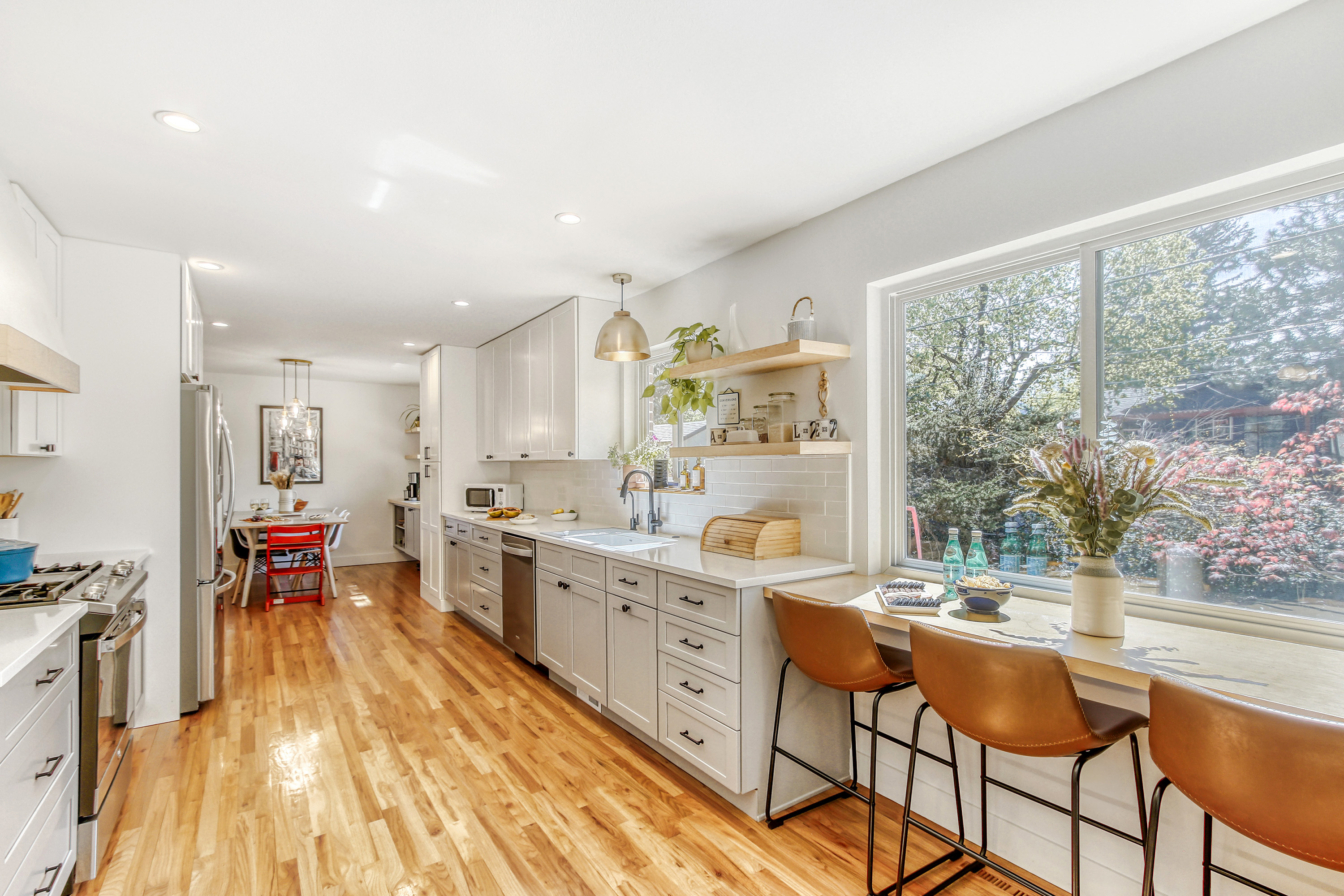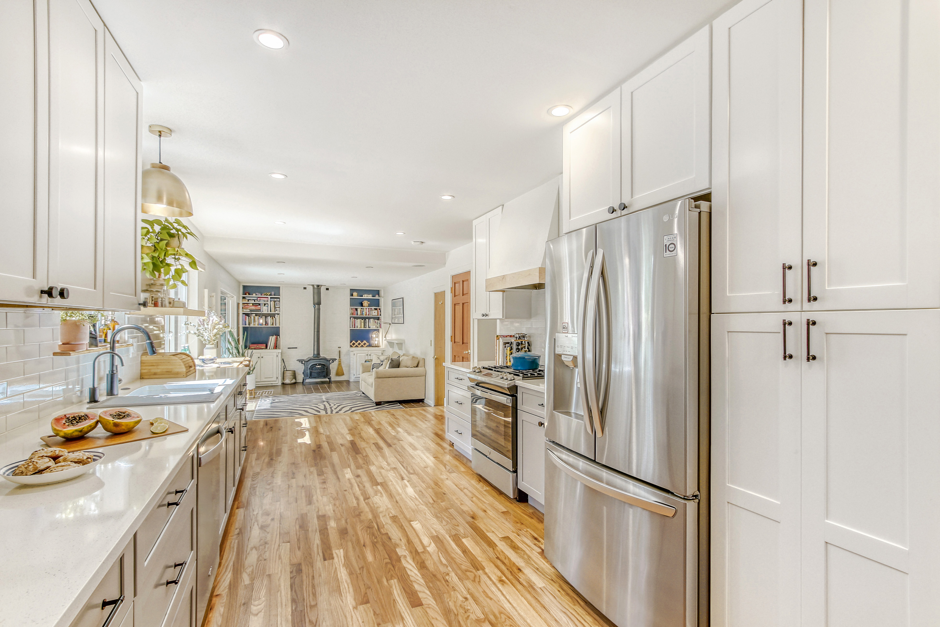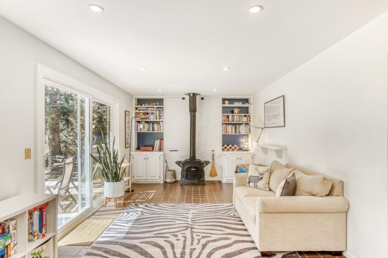 Start your mornings with coffee on the charming front porch, then step inside to a light-filled interior. The open-concept living area seamlessly connects the kitchen and family room, creating a warm and inviting space to gather. A cozy wood stove anchors the family room, which opens directly to the patio and backyard, where you’ll find a BBQ area surrounded by nature—ideal for relaxing afternoons and enjoying meals outdoors.