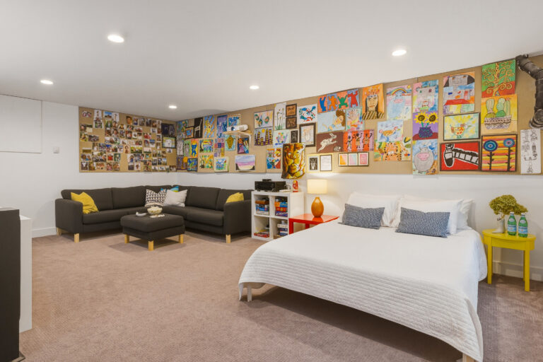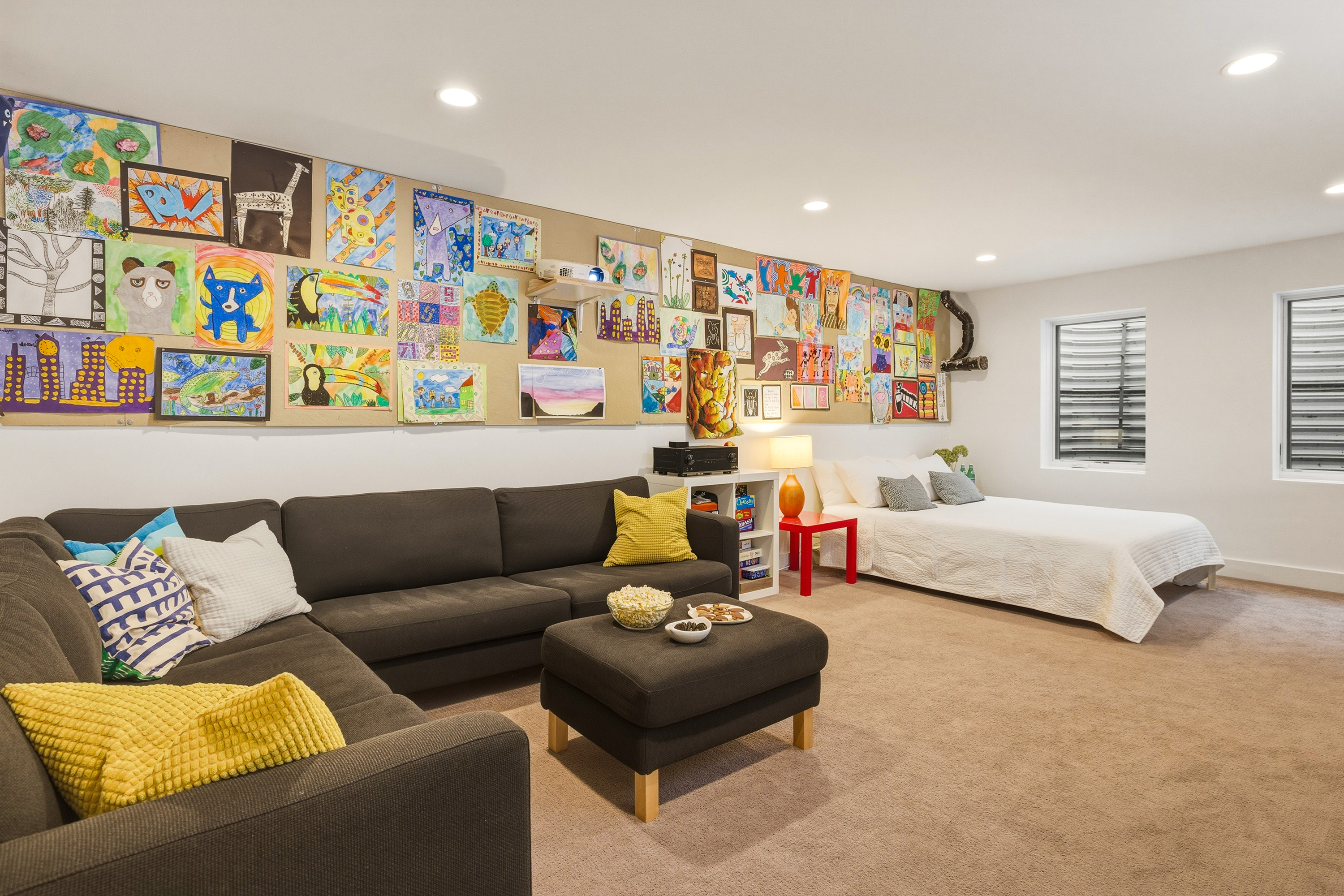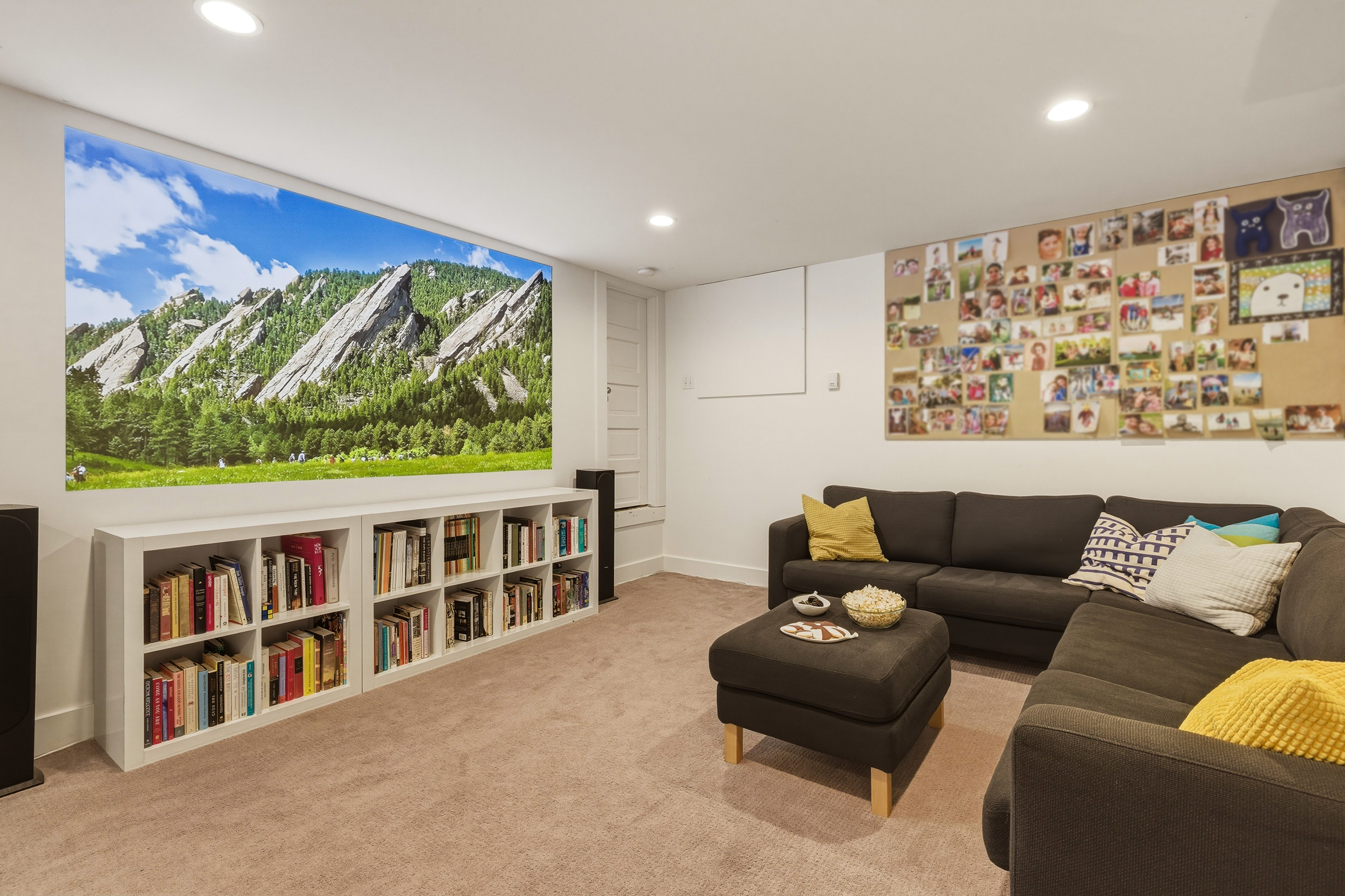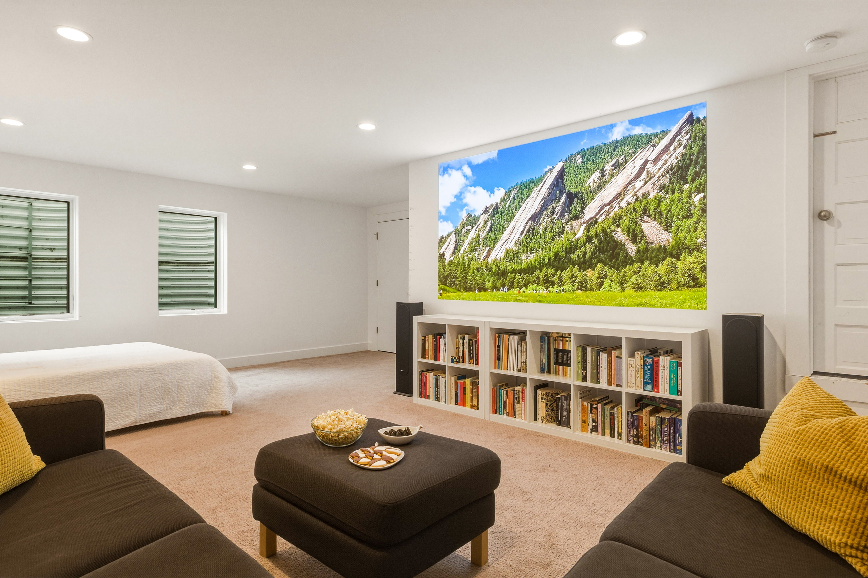 The basement is a refuge with a home theater featuring a projector and sound system—perfect for movie nights! It also includes a queen-size sofa bed, providing an additional sleeping arrangement for guests.